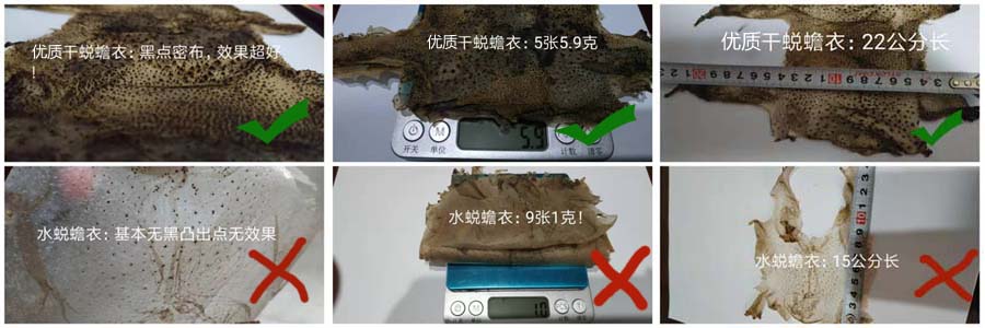 以下是某寶某多多的劣質(zhì)蟾衣和我們的優(yōu)質(zhì)天然蟾衣對比